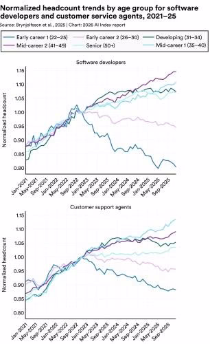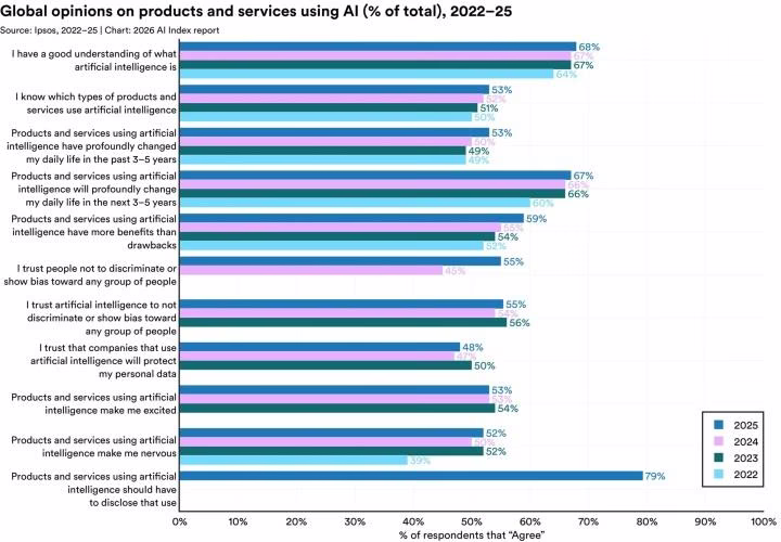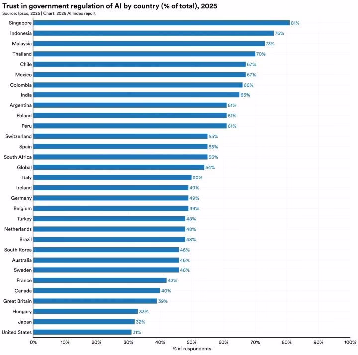 The impression on the workforce is extremely advanced. We’re seeing a drop in entry-level coding and buyer help jobs, however mid-to-senior roles are holding regular. As for public opinion, 59% of individuals now consider the advantages of AI outweigh the harms, however we nonetheless don’t belief our regulators. Within the US, solely 31% of individuals belief the federal government to manage AI correctly.