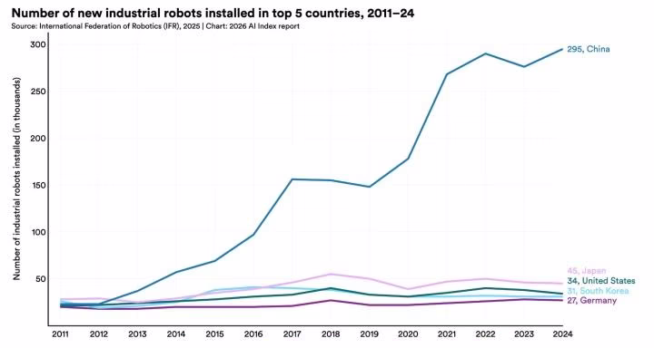 Whereas the US is obsessive about chatbots, China is automating bodily actuality. The information exhibits China put in a staggering 295,000 industrial robots in a single 12 months, in comparison with simply 34,200 within the US. Software program is superb, however China is constructing the bodily workforce of the longer term, and I feel we’re closely underestimating how essential that’s.